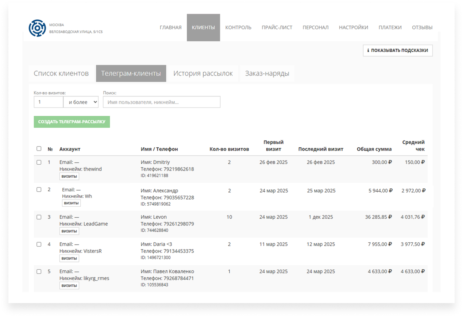 Точное расположение: Кабинет Управляющего → Клиенты → Телеграм-клиенты